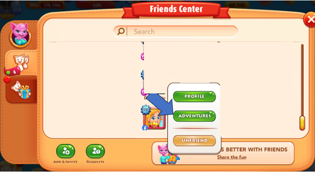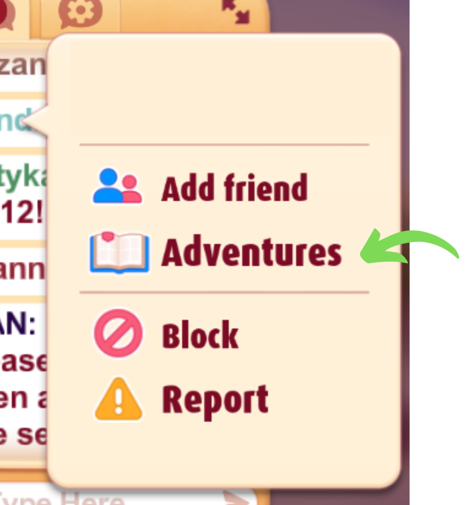You can view your friends’ Adventure Books through your Friends Center, simply choose a friend’s icon and click on Adventures. If you see your friends in the chat room, you can quickly view their Adventure Book by clicking on their icon and following the same steps.